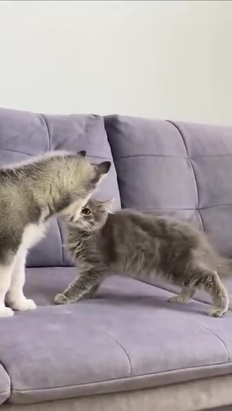Husky, pentu tapaa kissanpennun ensimmäistä kertaa.
